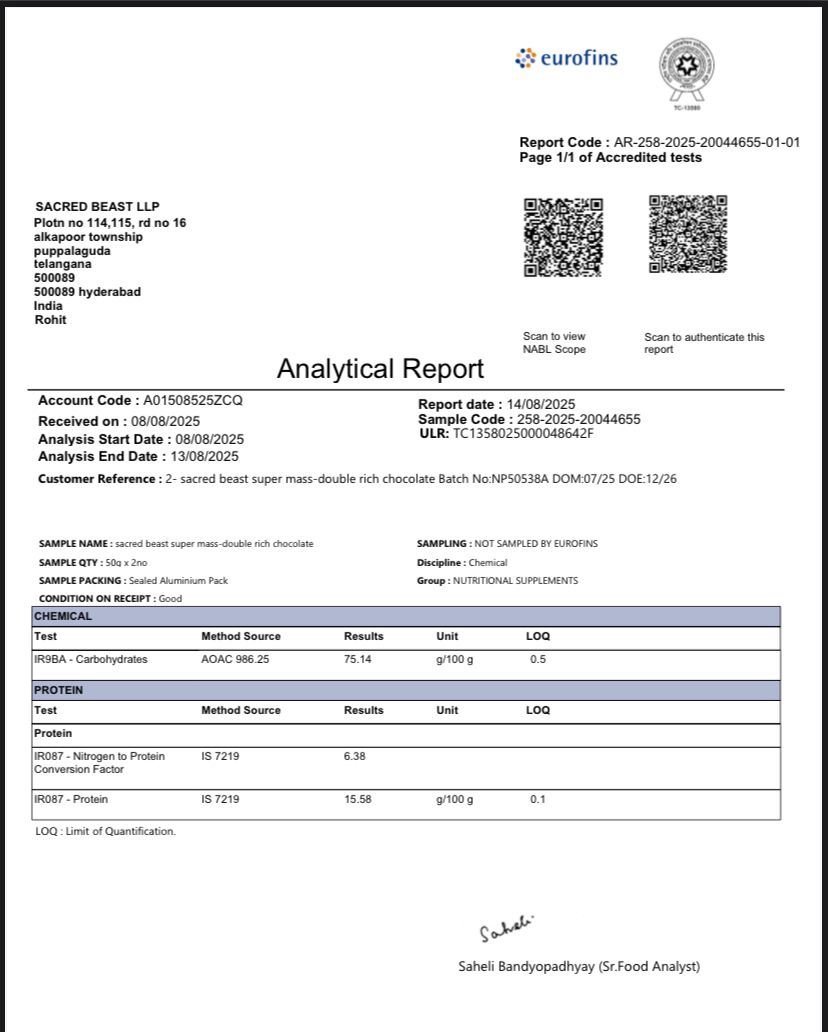 Sacred Beast Super Mass — High-Calorie Mass Gainer | 1324 kcal | 53g Protein | Double Rich Chocolate