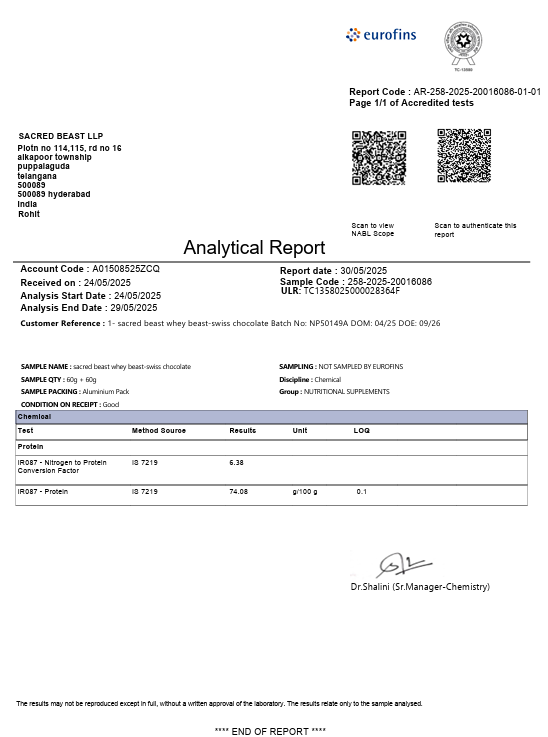 Whey Beast is a premium-quality protein supplement crafted for fitness enthusiasts who value authenticity and results. Each 33g scoop provides 25g of protein, 5.5g of BCAAs, and 4.4g of Glutamic Acid, At Sacred Beast, we believe in clean nutrition and genuine performance support—made by athletes, for athletes.